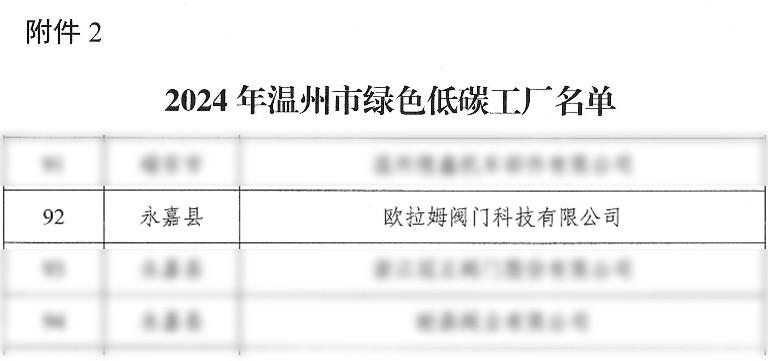 據(jù)今日永嘉消息 近日,溫州市經(jīng)濟(jì)和信息化局公布了2024年溫州市綠色低碳工廠名單,歐拉姆閥門(mén)科技有限公司等9家企業(yè)獲評(píng)2024年溫州市綠色低碳工廠。